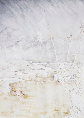 żółtawe kartki z plamami akwareli w kolorze sepii. Następnie, na podstawie